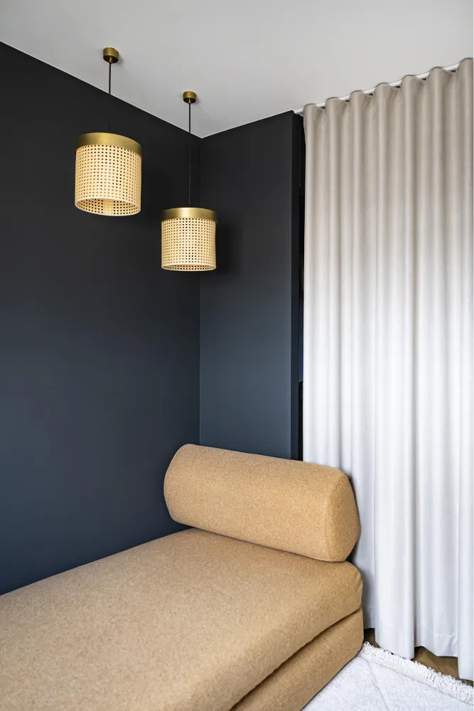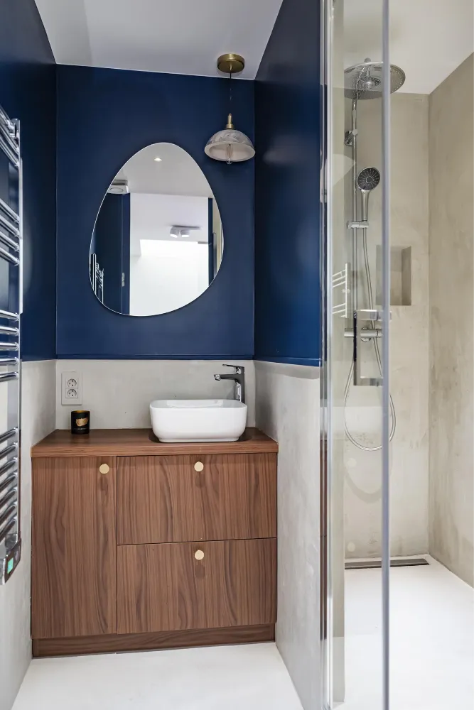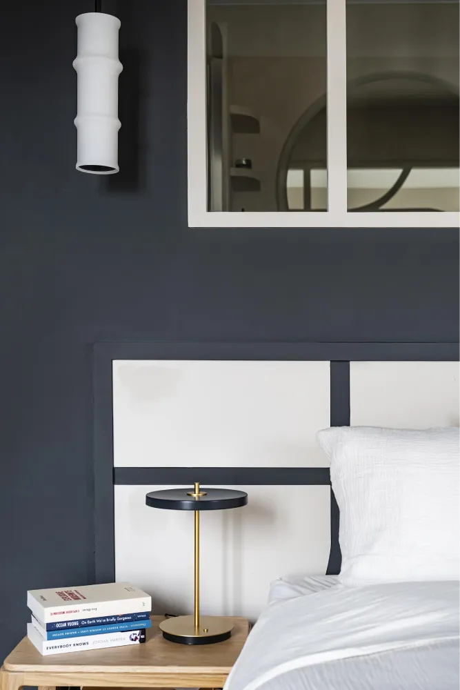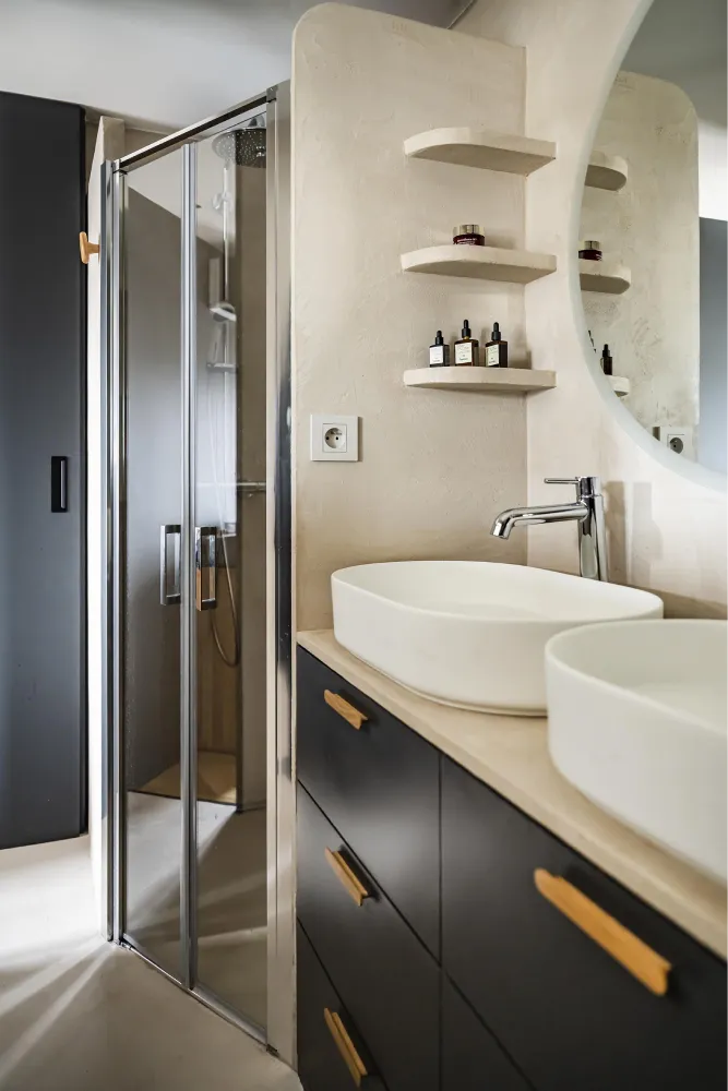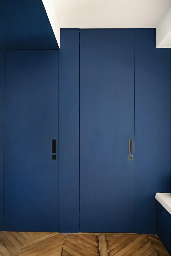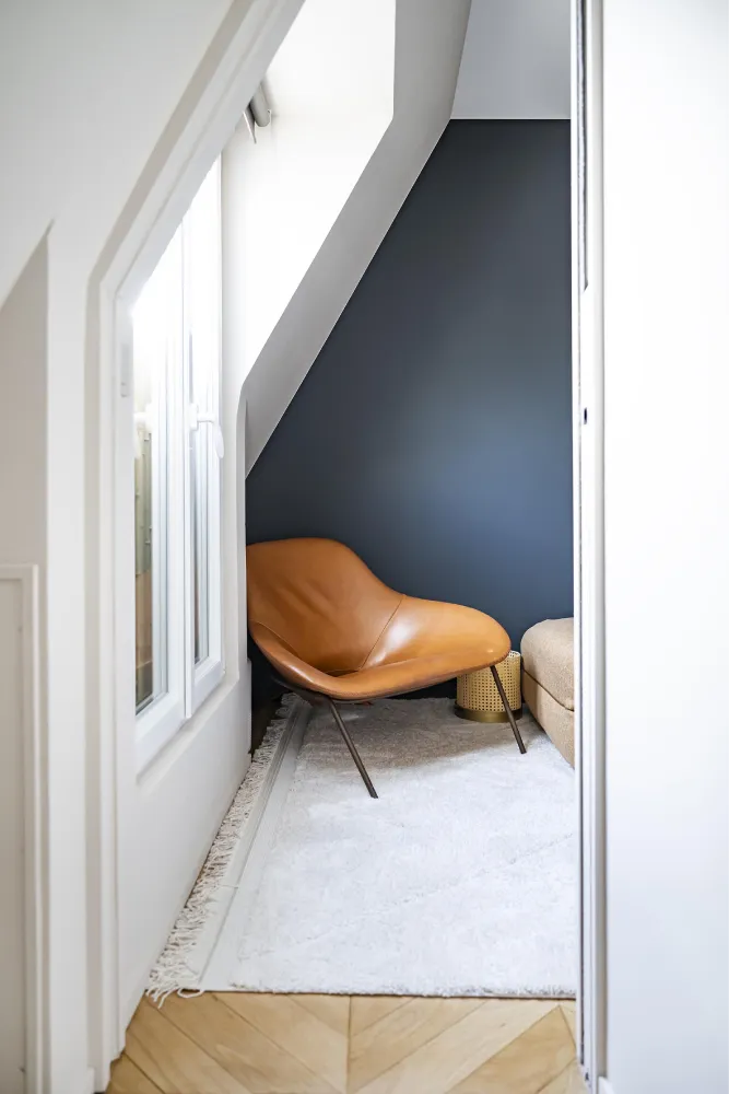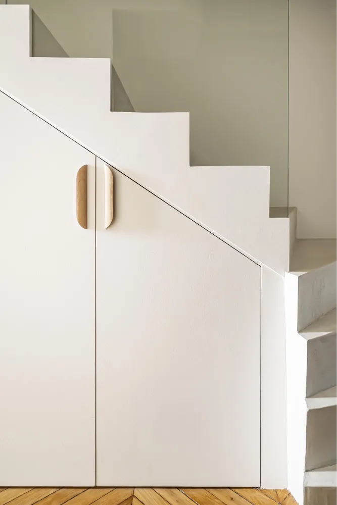 L’appartement adopte une palette de blancs cassés, associée à des matières minérales et au bois naturel, ponctuée de quelques touches de bleu profond. Cette base sobre et raffinée sert de fil conducteur à l’ensemble du duplex, pour un style japandi lumineux cohérent de l’entrée à la suite parentale.