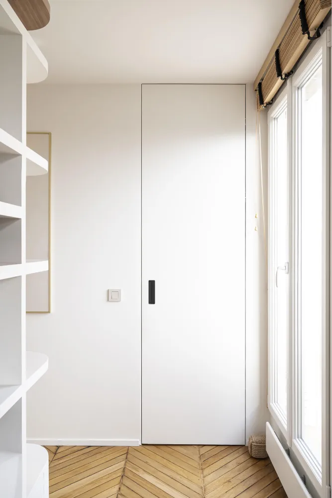 Pour accentuer la verticalité et la perception de volume, toutes les portes ont été réalisées sur mesure en toute hauteur. Elles soulignent la hauteur sous plafond et participent à la pureté des lignes, tout en renforçant l’élégance discrète de ce duplex Rue des Archives.