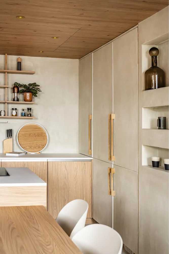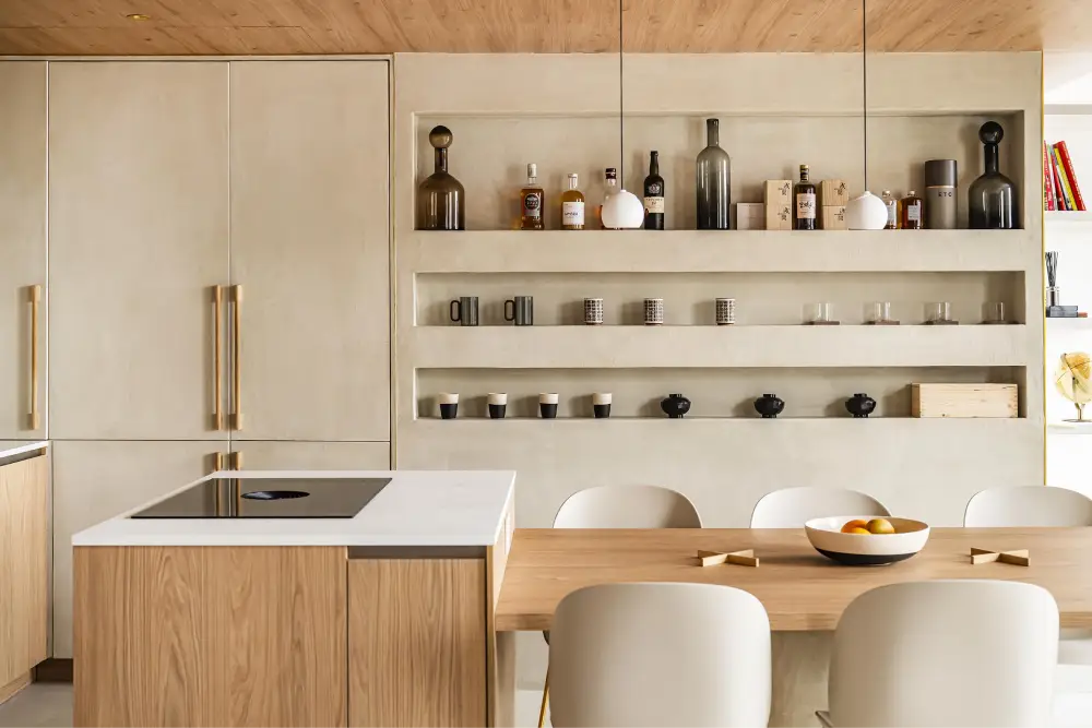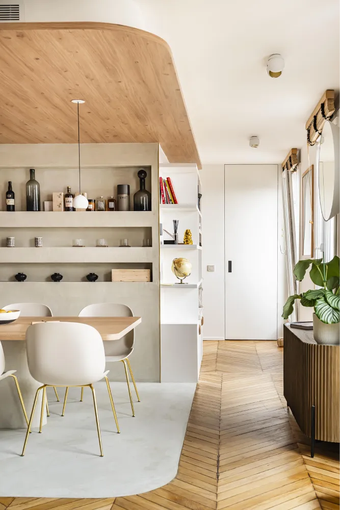 Au cœur de cet appartement parisien, la cuisine ouverte devient la pièce maîtresse. Directement liée à la salle à manger, elle s’inspire des codes japandi : façades en bois naturel, surfaces minérales, lignes sobres et rangements intégrés qui limitent le visuel et renforcent la sensation d’ordre et de calme.