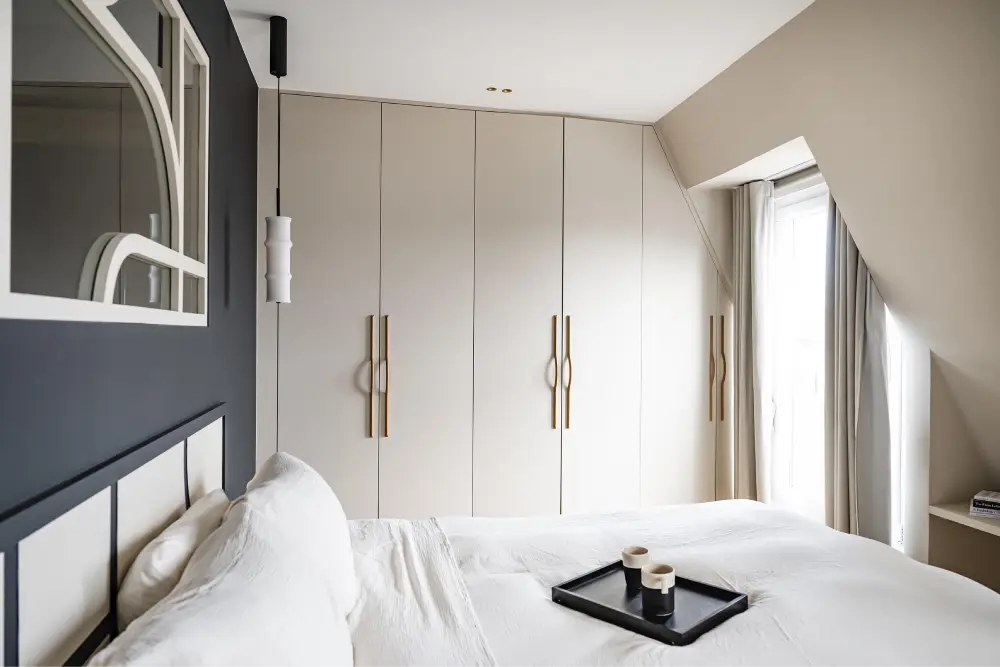 Légèrement mansardée, cette pièce représentait un vrai défi d’agencement sur mesure. Les volumes ont été travaillés avec précision pour optimiser le moindre recoin, tout en préservant une atmosphère apaisante.