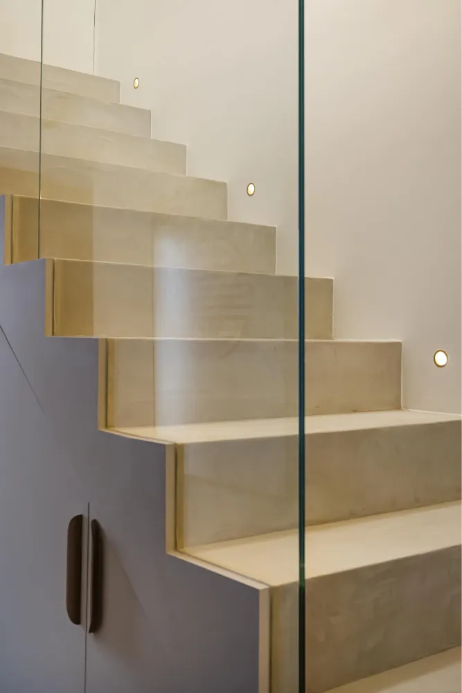 - Escalier sur mesure avec paroi de verre toute hauteur et buanderie intégrée discrète.