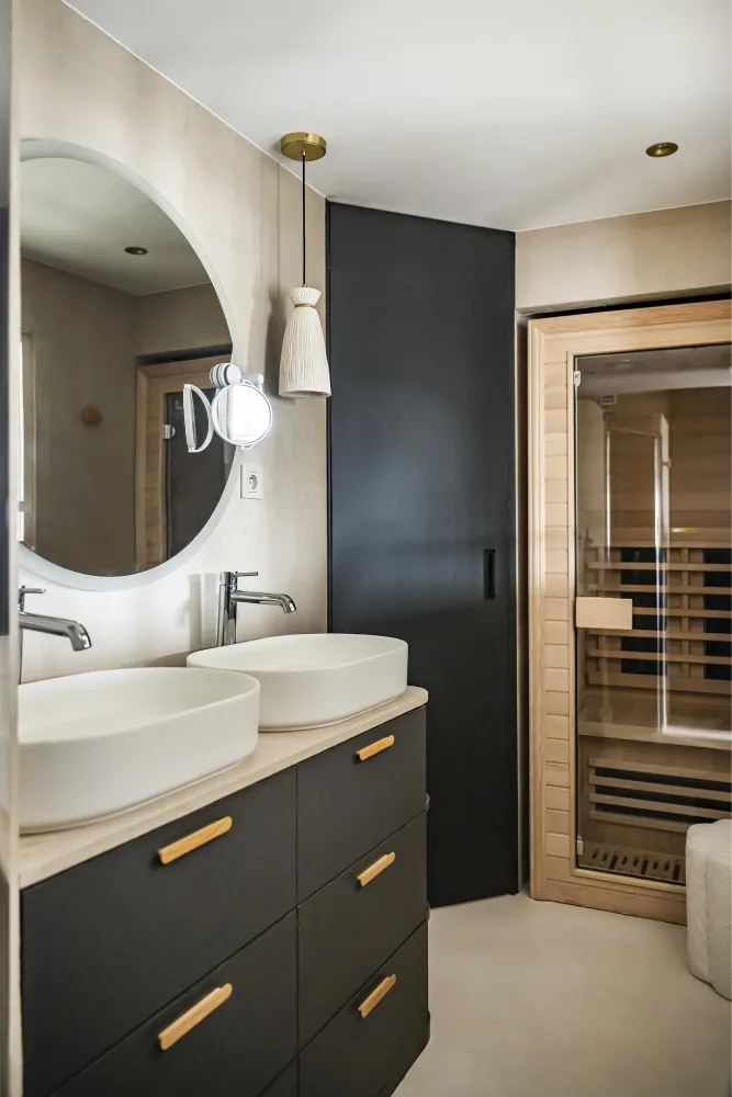 - Suite parentale avec salle de bain, sauna, coin café et rangements optimisés, complétée par une chambre d’appoint avec dressing dissimulé.