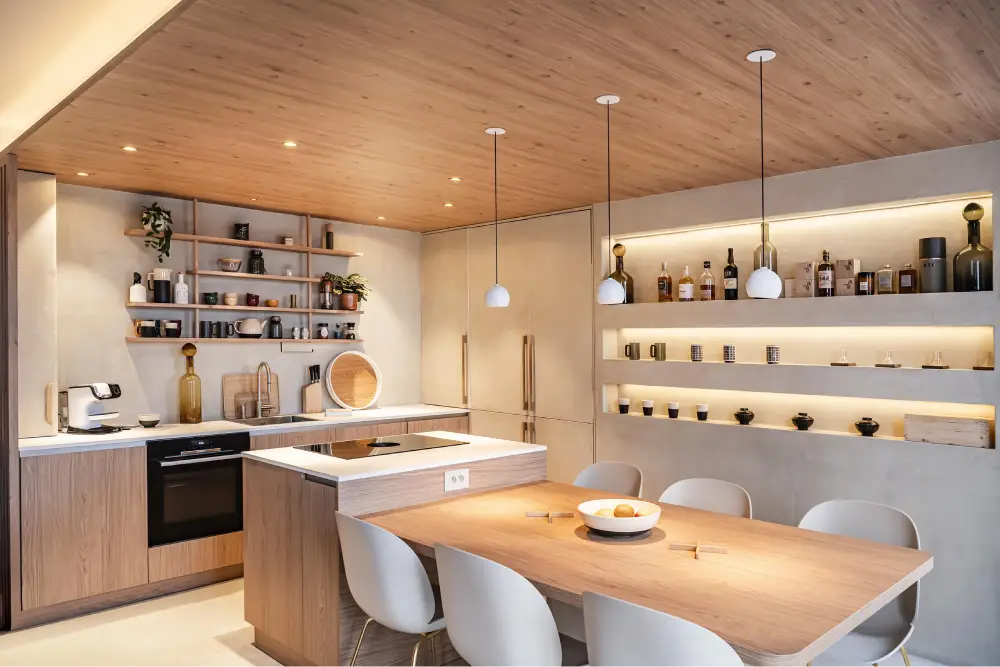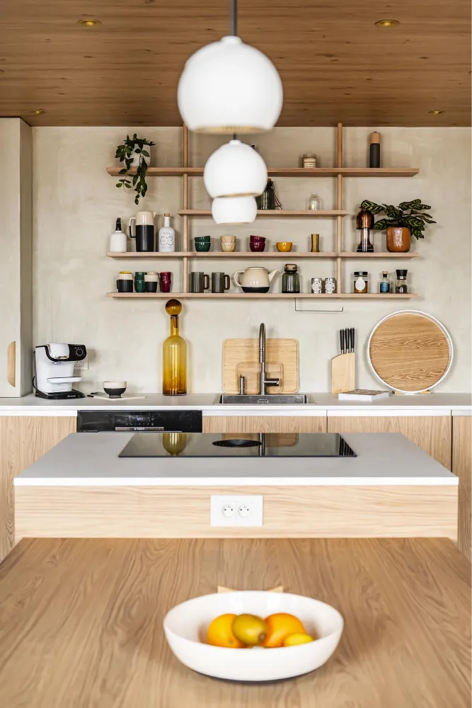 - Création d’un grand espace de vie fluide réunissant cuisine ouverte japandi, salle à manger et salon.