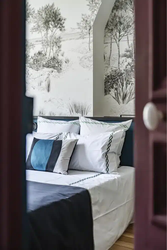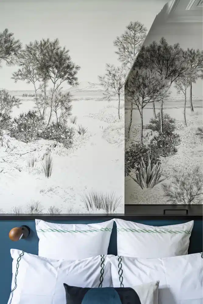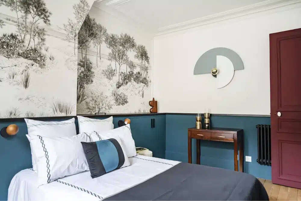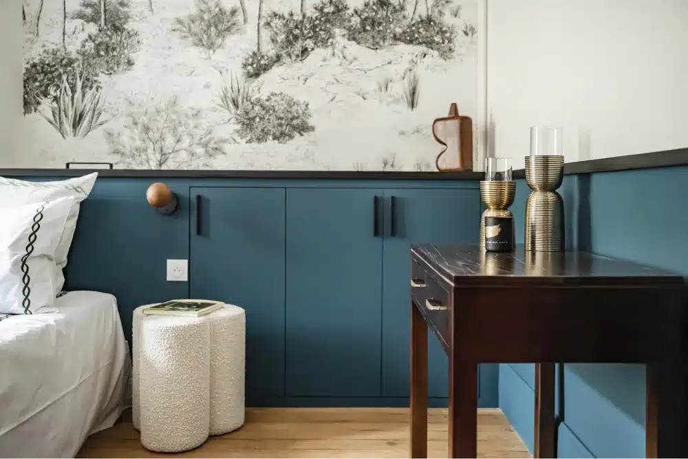 - Agencement sur mesure : Création de menuiseries spécifiques, notamment des têtes de lit et des bibliothèques intégrées.