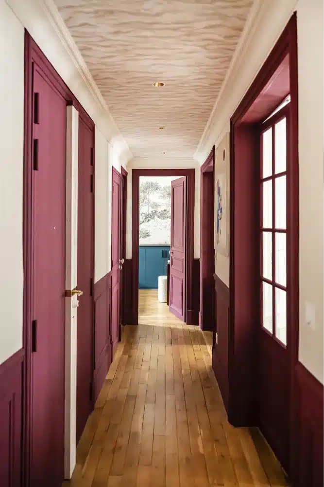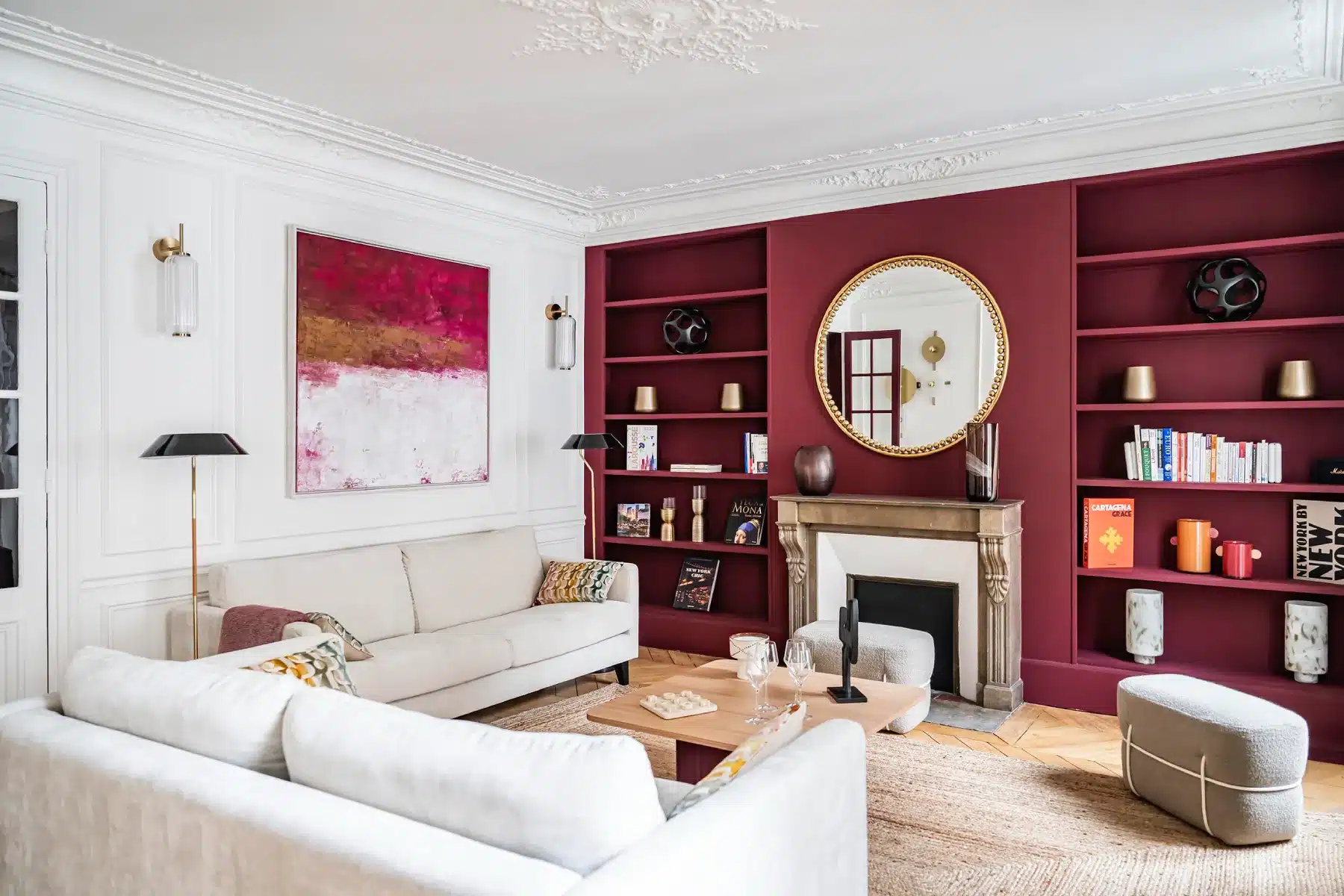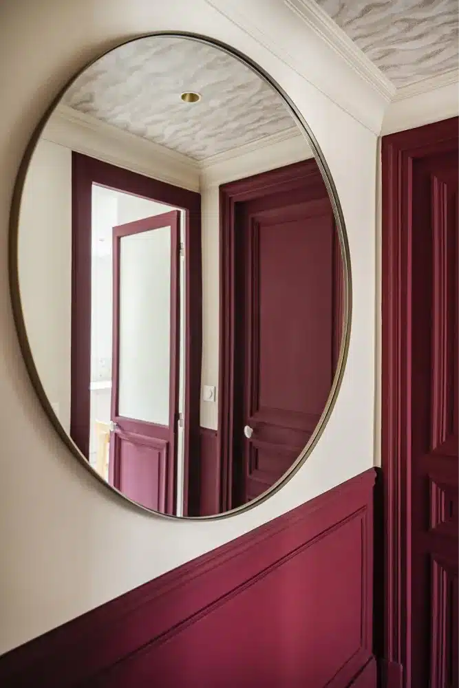 Oui, à condition de les utiliser pour structurer l’espace. Ici, le Bourgogne profond sublime les moulures blanches et apporte une signature intemporelle sans réduire la sensation d’espace grâce aux belles hauteurs sous plafond.