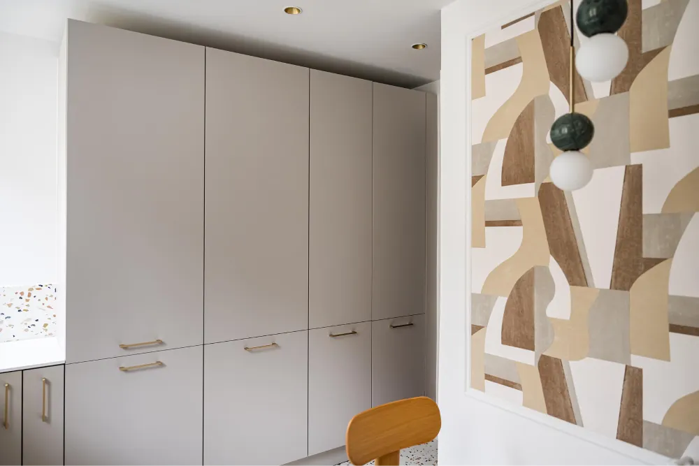 L’astuce réside dans le contraste. Des luminaires sculpturaux et audacieux viennent rythmer les moulures classiques, tandis que des agencements sur mesure aux lignes épurées (comme les têtes de lit) apportent la fonctionnalité moderne nécessaire.